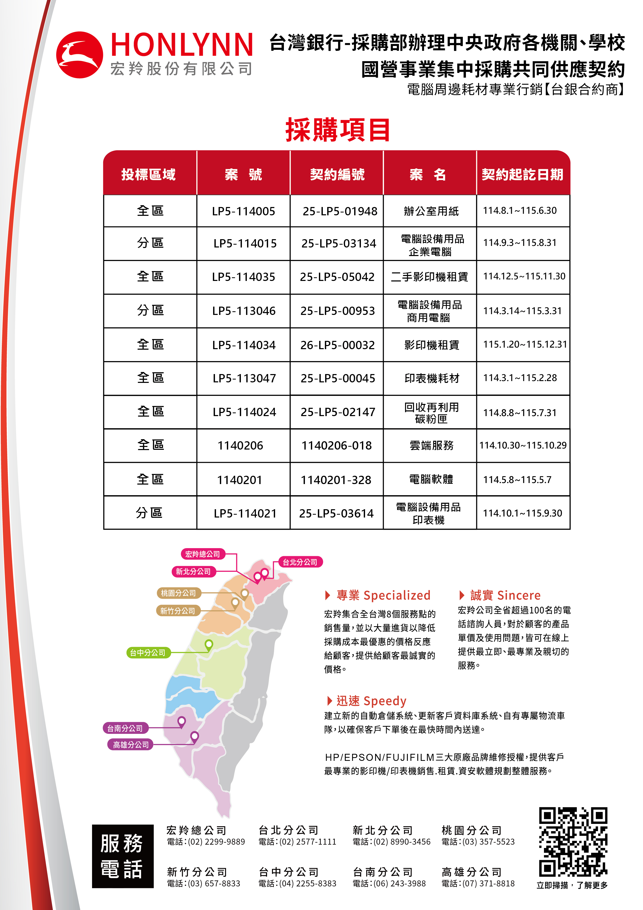 註:本網站有關宏羚公司所有決標資料, 包含得標項目、規格、投標廠牌、契約金額..等資料,若有誤植者, 以共同供應契約網站刊登為準。