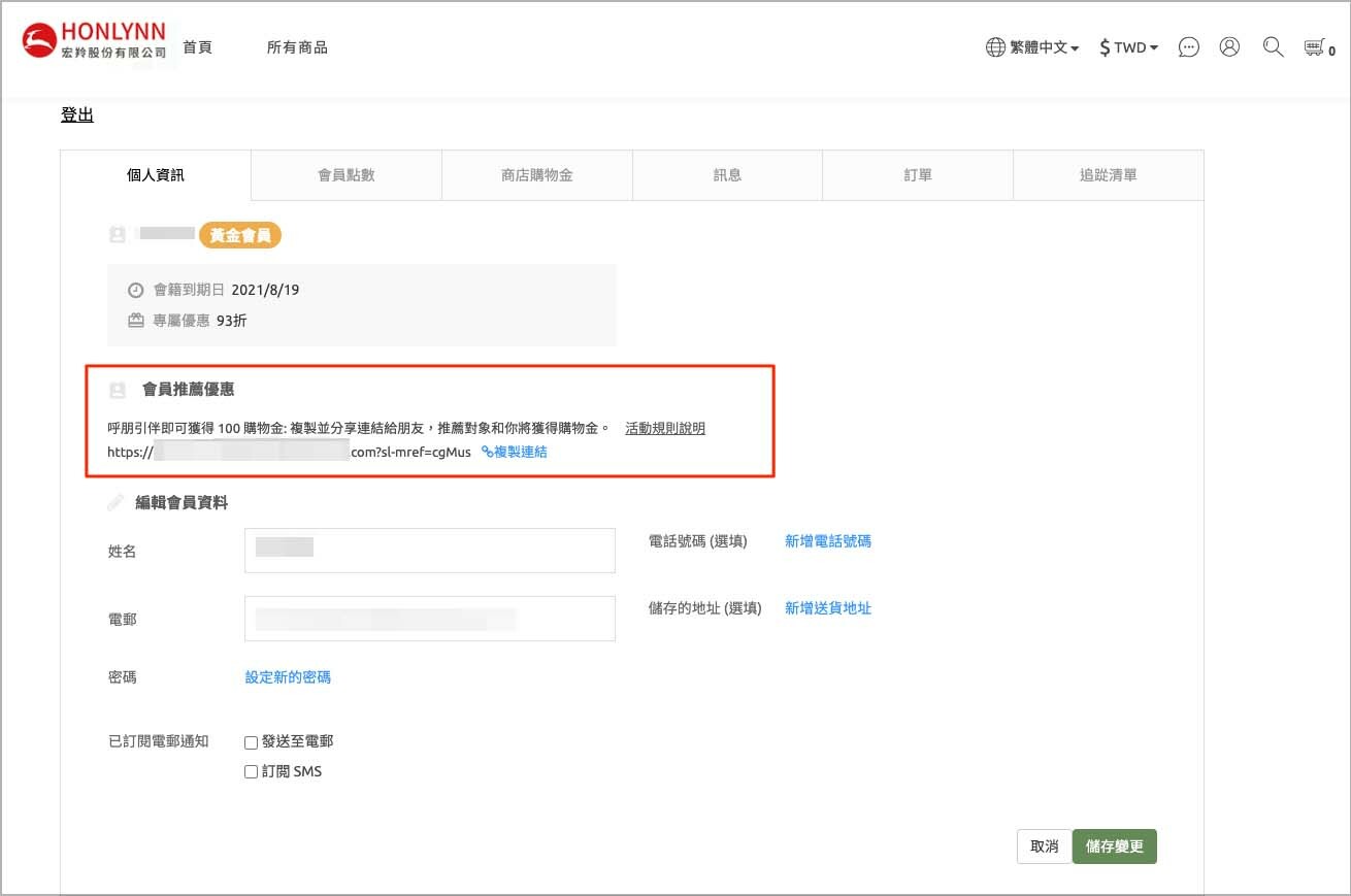前往「商店前台 > 會員中心 > 個人資訊」,找到「會員推薦優惠」區塊,點按「複製連結」,即可成功複製會員推薦連結。