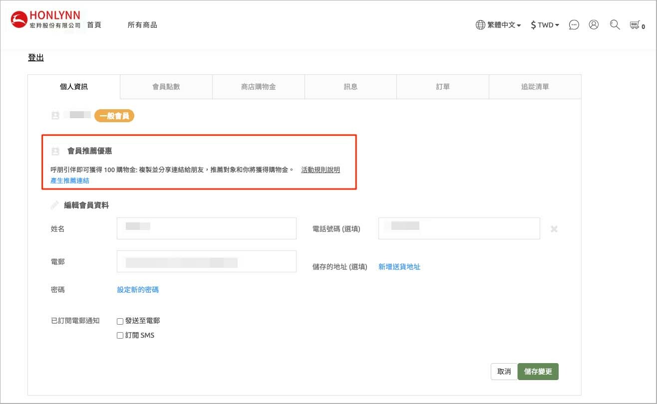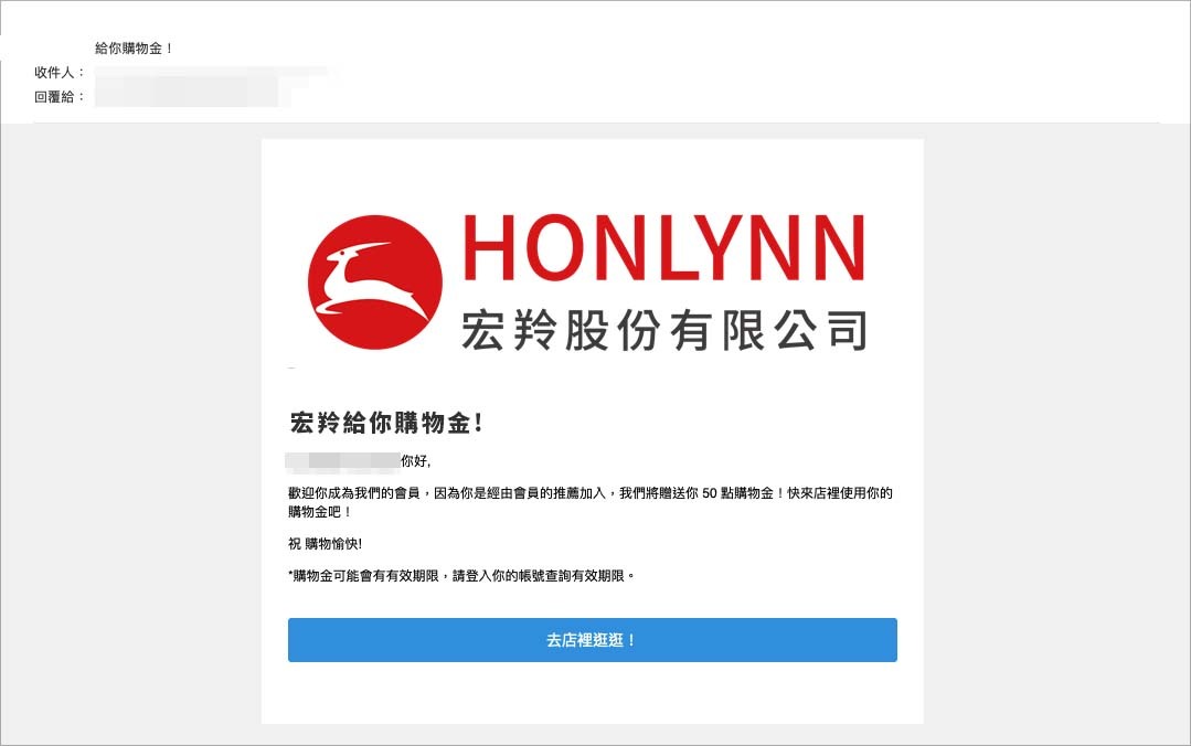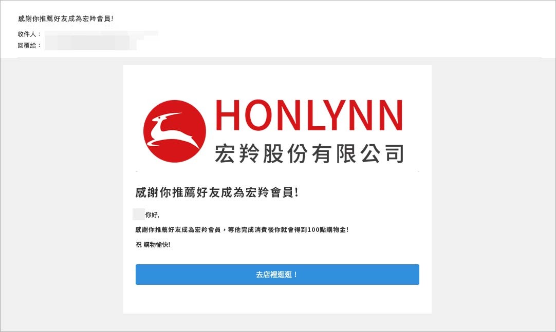 將連結分享給朋友,待朋友成功註冊且第一筆訂單狀態更改為「已完成」,該會員(推薦人)即可獲得購物金。而系統在購物金成功發送給推薦人後,會寄送信件通知,如下圖所示。